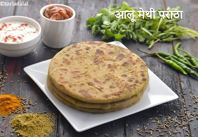 आलू मेथी पराठा — मेथी के पत्ते आलू की भरावन में मिट्टी-सा सुगंधित स्वाद जोड़ते हैं।