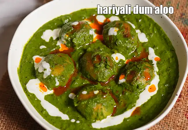 हरियाली दम आलू (पंजाबी स्टाइल) — बेबी आलू को हरी मसालेदार और गाढ़ी ग्रेवी में धीमी आंच पर पकाया जाता है; रेस्टोरेंट-स्टाइल की पसंदीदा डिश।
