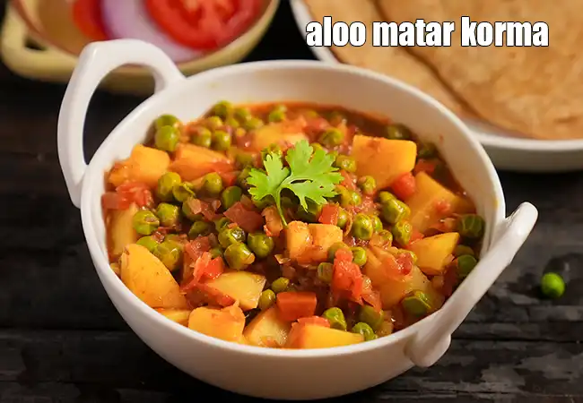 aloo mutter korma - meaning "potato and peas in creamy gravy," is a comforting and flavorful Indian dish.