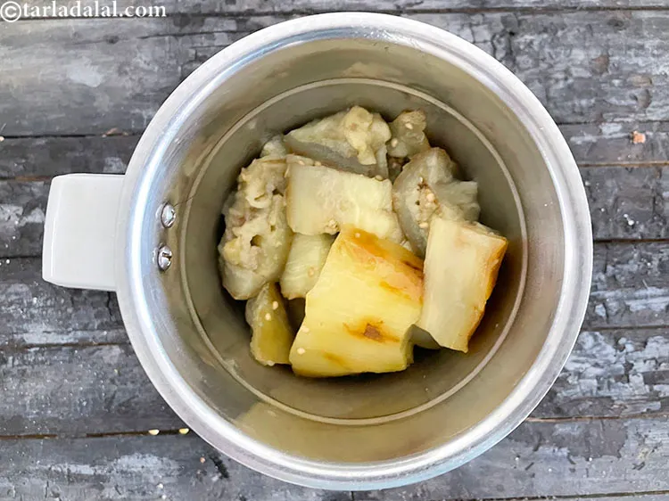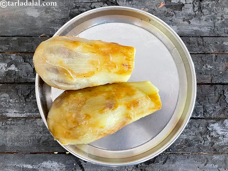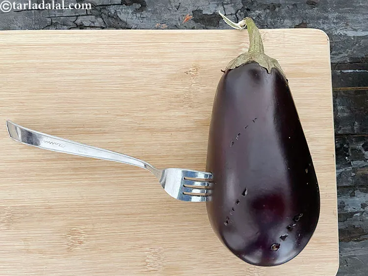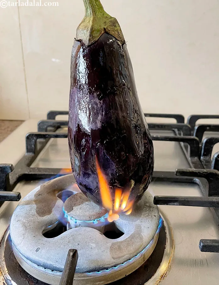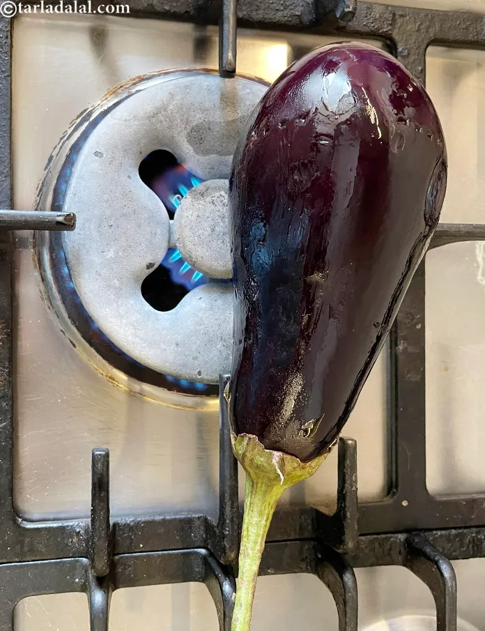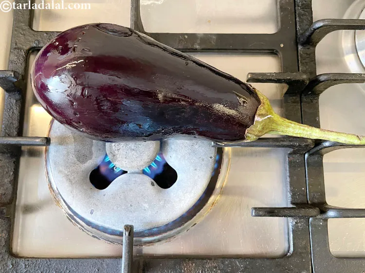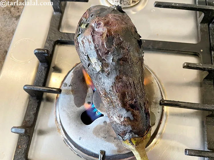 - Prick the brinjal with a fork, brush it evenly with oil and roast it over an open flame for 10 minutes or till the brinjal turns black from all the sides and the flesh is soft and pulpy. Allow it to cool slightly.