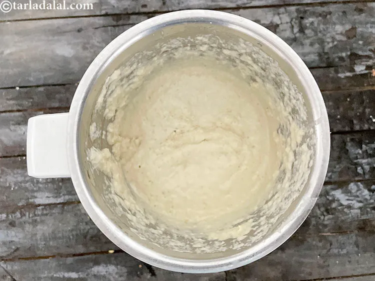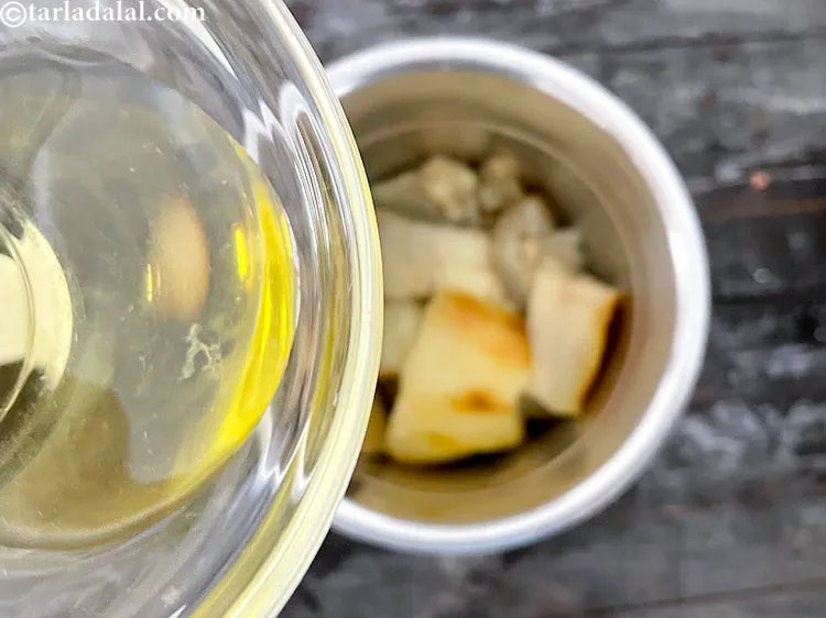 - Combine the brinjals, olive oil, tahini paste, garlic, cumin seeds powder, lemon juice and salt in a mixer and blend till smooth.