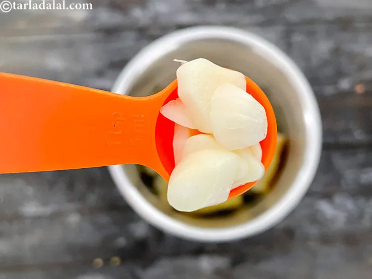 Add 1 tsp roughly chopped garlic (lehsun). Garlic has been proven to lower cholesterol. The active ingredient allicin present in garlic aids in lowering blood pressure. Garlic is also alleged to help regulate blood glucose levels for diabetics. Garlic is great for the heart and circulatory system. Garlic has an antimicrobial, antiviral and antifungal function and can help in relieving common cold and other viral infections. To boost your immune system have a garlic clove a day. Garlic is a top anti viral food. The thiosulphate compound, Allicin found in garlic acts as a strong antioxidant and protects our body from damage of free radicals. Read here for complete benefits of garlic.