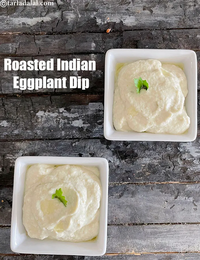 - What is baba ganoush made off? roasted Indian eggplant dip is made from 2 medium sized dark skinned brinjals (baingan / eggplant), 1 tsp olive oil for greasing, 2 tbsp olive oil, 2 tbsp tahini paste, 1 tsp roughly chopped garlic (lehsun), 1/2 tsp cumin seeds (jeera) powder, 2 tsp lemon juice and salt to taste.