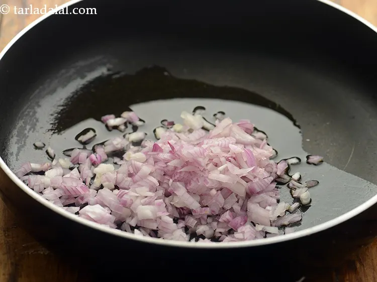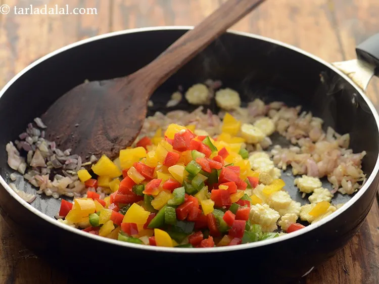 - To make baby corn and capsicum rice, heat the oil in a broad non-stick pan, add the onions and garlic and sauté on a medium flame for 1 minute.