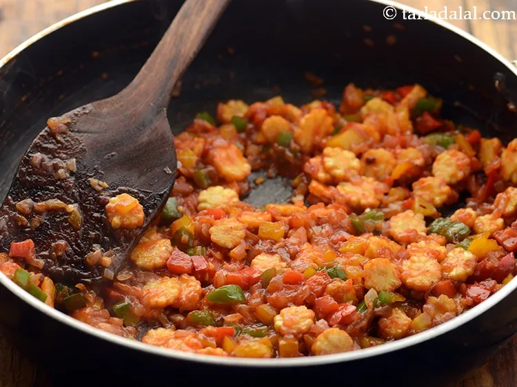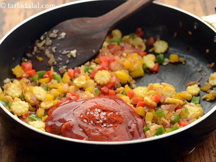 - Add the tomato ketchup, tomato purée, chilli powder and sugar, mix well and cook on a medium flame for 1 minute, while stirring occasionally.