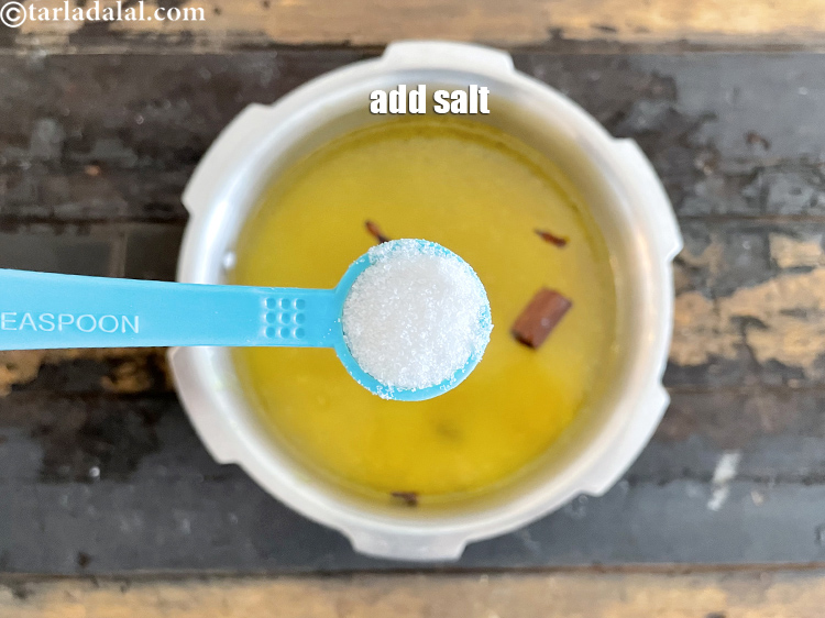 - एक प्रैशर कुकर में घी गरम करें, लौँग और दालचीनी डालकर मध्यम आँच पर कुछ सेकन्ड तक भुन लें।