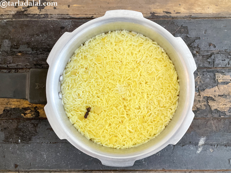 - चावल, तुवर दाल, नमक और 4 कप गरम पानी डालकर अच्छी तरह मिला लें और 4 सिटी तक प्रैशर कुक कर लें।