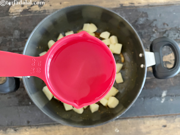 - आलू , नमक और १/४ कप गरम पानी डालकर अच्छी तरह मिला लें। ढ़क्कन से ढ़ककर, मध्यम आँच पर 8 से 10 मिनट या आलू के नरम होने तक, बीच-बीच में हिलाते हुए पका लें।