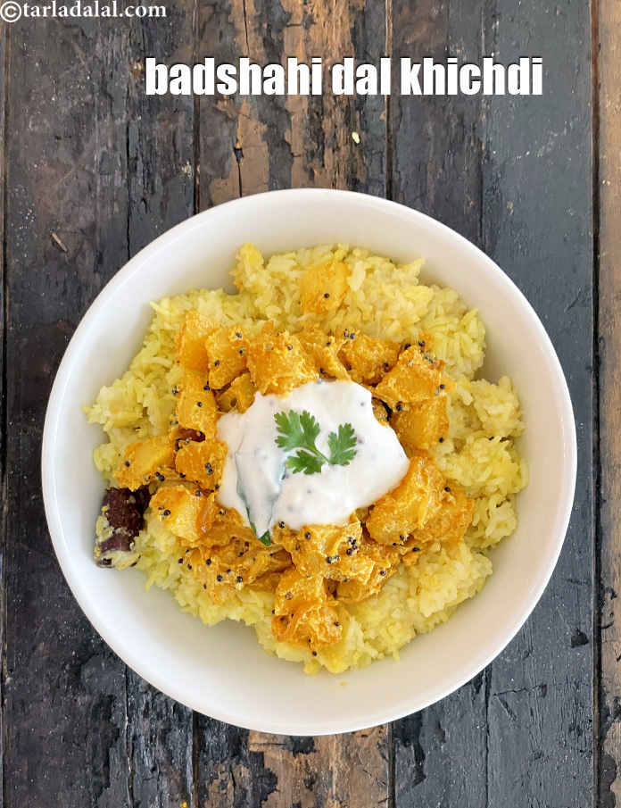 जहाँ खिचड़ी का नाम सुनते ही हमें घर पर बने सादे खाने की याद आती है, यह सादी खिचड़ी का एक शानदार रुप है - बादशाही दाल की खिचड़ी। रोज़ प्रयोग होने वाले मसालों से बने दाल-चावल के मेल के उपर आलू की स्वादिष्ट सब्ज़ी की परत और तड़के लगे दही को डालकर इसे बनाया गया है।