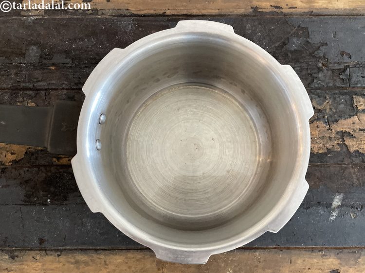 प्रेशर कुकर में २ टेबल स्पून घी गरम करें।