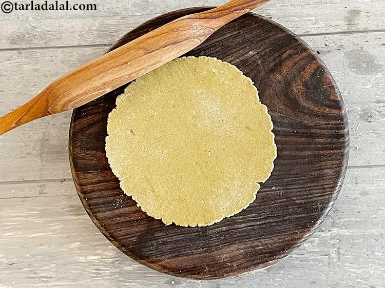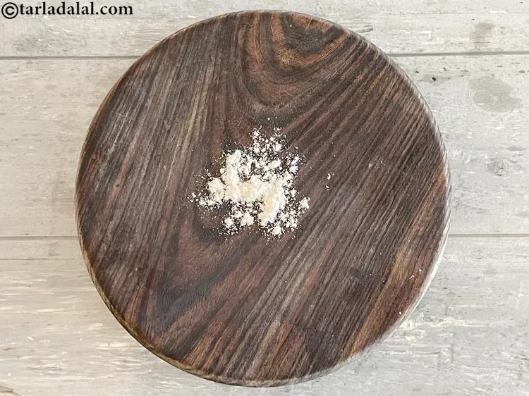 आटा के एक हिस्से को ७५ मि। मी। (३”) व्यास के गोल में थोड़े गेहूं के आटे का उपयोग करके बेल लें।