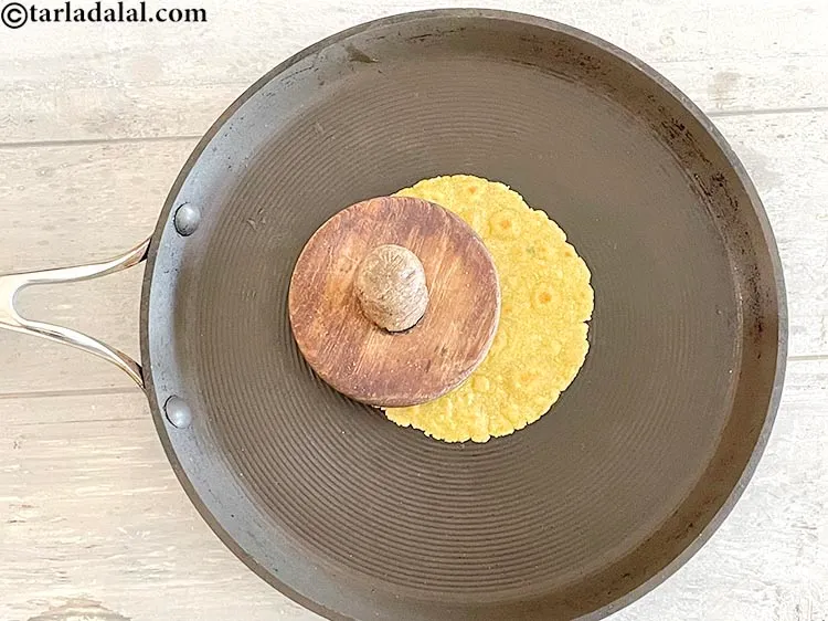खाखरा को धीमी आंच पर एक मुड़े हुए मलमल के कपड़े या खाखरा प्रेस के साथ से दबाते हुए पकाना जारी रखें, जब तक कि यह दोनों तरफ कुरकुरा और सुनहरे भूरे रंग के धब्बे दिखाई न दें।