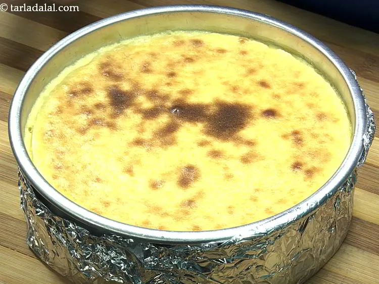 Pour hot water around it till it covers ¼ of the tin. This method of cooking is called as a water bath. The steam from the hot water will lift the cheesecake up slowly and evenly, reducing the risk of cracks on top and sinking back down as it cools.
