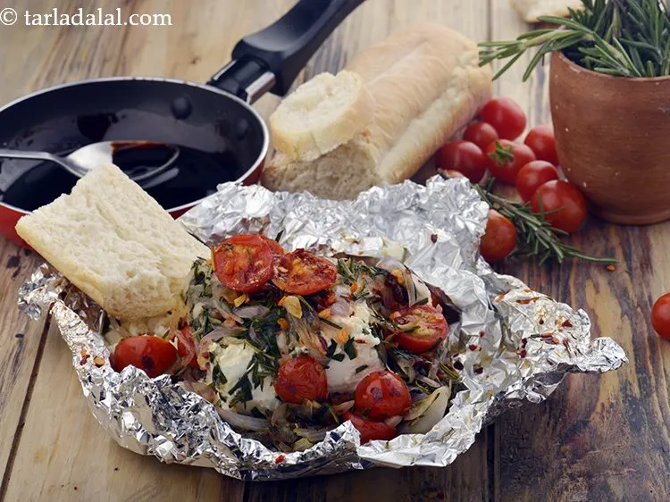 To make baked herbed feta cheese with bread, first combine balsamic vinegar, cinnamon and honey in a small pan and cook on a medium flame for 3 minutes or till thick, while stirring continuously. Keep aside. Then heat the olive oil in a broad non-stick pan, add the garlic and sauté on a medium flame for 30 seconds. Add the onions and sauté on a medium flame for 2 minutes. Add all the fresh herbs and sauté on a medium flame for 1 minute. Keep aside. Place a foil on a clean, dry surface, spread half of the prepared herbed mixture in the centre. Place the feta cheese block over it. Spread the remaining prepared herbed mixture evenly over it and press it lightly. Place the cherry tomato halves on top and sprinkle chilli flakes evenly over it. Cover all the sides of the foil and pack it very well like a parcel. Bake in a pre-heated oven at 200ºC (400ºF) for 10 minutes. Serve immediately with thickened balsamic vinegar and toasted bread.