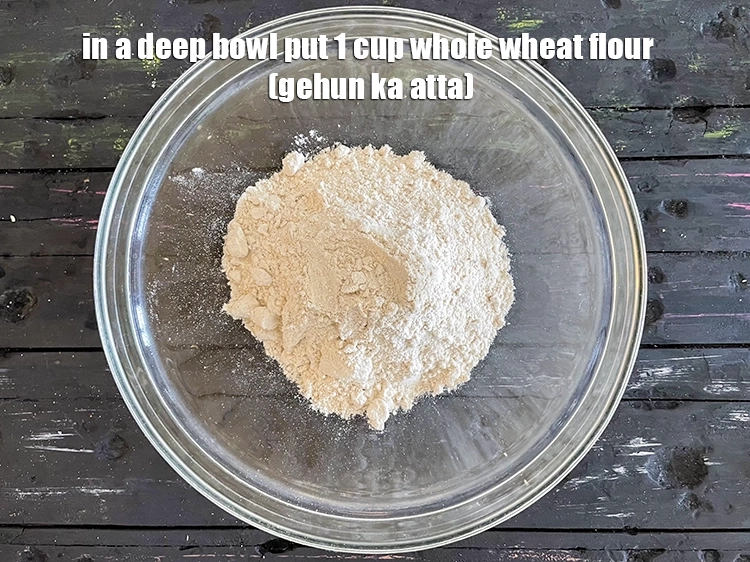 एक गहरे कटोरे में 1 कप गेहूं का आटा (whole wheat flour, gehun ka atta) डालें।