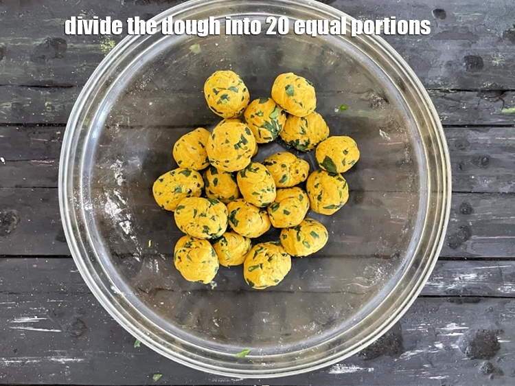 एक बार जब आटा तैयार हो जाए, तो इसे 20 बराबर भागों (equal portions) में विभाजित करें। अगला कदम प्रत्येक भाग को बेलना है। प्रत्येक टुकड़े को लगभग 75 मिमी (3 इंच) व्यास के गोले में बेलने के लिए बेलन का उपयोग करें। यह सुनिश्चित करने के लिए कि पूरियां बेकिंग के दौरान सपाट और कुरकुरी रहें (और तली हुई पूरी की तरह फूलें नहीं), कांटे का उपयोग करके पूरी सतह पर छेद करना (prick all over using a fork)महत्वपूर्ण है। यह सरल क्रिया बेक्ड स्नैक की सपाट, बिस्किट जैसी बनावट प्राप्त करने के लिए आवश्यक है।