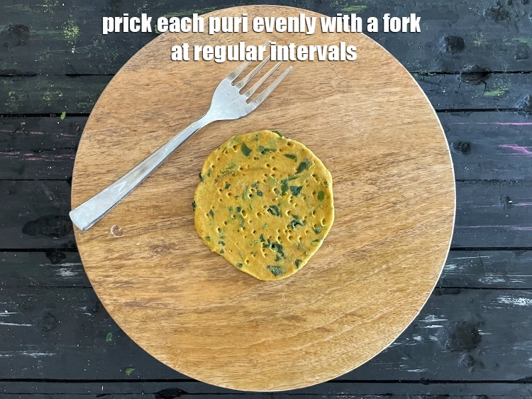 - नियमित अंतराल पर कांटे से प्रत्येक पूरी को समान रूप से छेदें (prick)। छेद करने से यह सुनिश्चित होता है कि पूरी फूलेगी नहीं और बेकिंग के बाद आपको कुरकुरी पूरी मिलेगी।