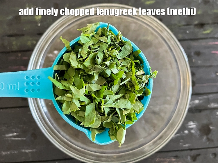 इसमें 1/2 कप कटी हुई मेथी की पत्तियां (chopped fenugreek leaves, methi) डालें।