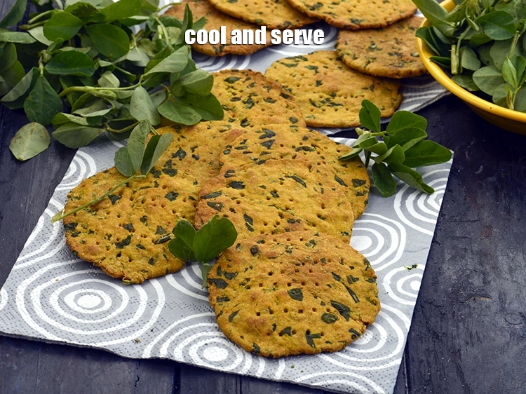 - बेक्ड मेथी पूरी को ठंडा करके परोसिये या एयर टाइट कन्टेनर में भर कर रख लीजिये।
