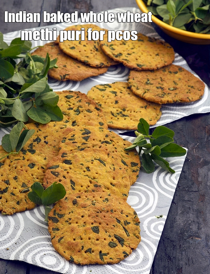 बेक्ड मेथी पूरी रेसिपी | पीसीओएस, गर्भावस्था, मधुमेह और हृदय के लिए भारतीय बेक्ड पूरी गेहूं मेथी पूरी |
