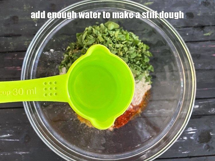 सख्त आटा गूंथने के लिए पर्याप्त पानी डालें। हमने पहले 1/4 कप पानी डाला और फिर बाद में 2 बड़े चम्मच पानी और डाला।