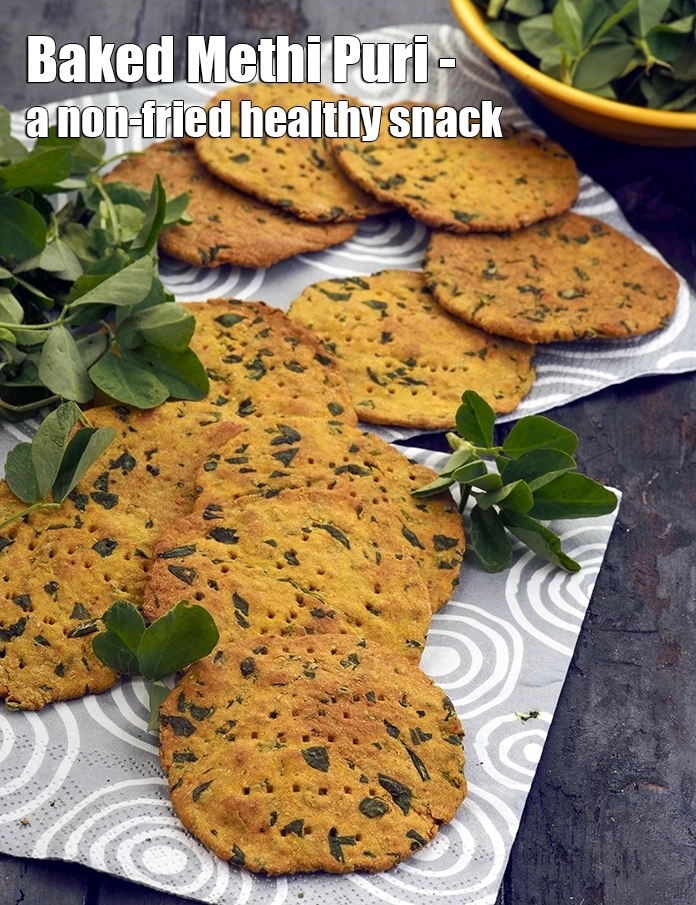 बेक्ड मेथी पूरी रेसिपी | पीसीओएस, गर्भावस्था, मधुमेह और हृदय के लिए भारतीय बेक्ड पूरी गेहूं मेथी पूरी | स्वस्थ चाय समय नाश्ता | baked methi puri in hindi | with 26 amazing images.