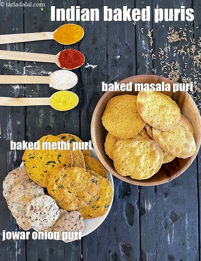भारतीय बेक्ड पूरियाँ। बाएँ से दाएँ: ज्वार प्याज पूरी और बेक्ड मसाला पूरी।