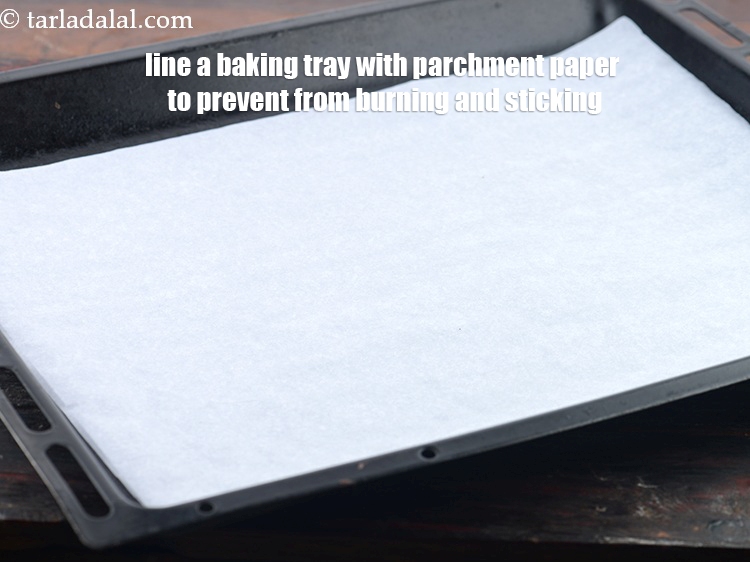 जलने और चिपकने से बचाने के लिए बेकिंग ट्रे पर चर्मपत्र कागज बिछा दें।
