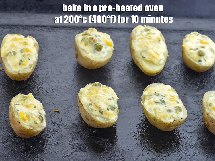The final cooking stage is quick and crucial for achieving a great texture. Place the stuffed potato cups on a baking tray. Bake in a pre-heated oven at 200∘C (400∘F) for 10 minutes. The high heat ensures that the filling gets hot and the cheese melts beautifully, while the potato cups develop a slightly firm exterior. The baking process yields a different, delightful texture compared to frying or deep-frying.