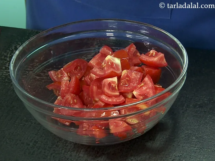 रेस्टोरेंट स्टाइल मखानी ग्रेवी बनाने के लिए | मखनी ग्रेवी रेसिपी | बेसिक मखनी ग्रेवी | पंजाबी मखनी ग्रेवी | मखानी ग्रेवी कैसे स्टोर करें | basic makhani gravy in hindi | एक गहरे कटोरे में टमाटर लें। प्राकृतिक रूप से चमकदार लाल रंग की ग्रेवी पाने के लिए ताजे लाल पके हुए टमाटरों का उपयोग करें। इसके अलावा, टमाटर को धो कर, पहले कटा लें।