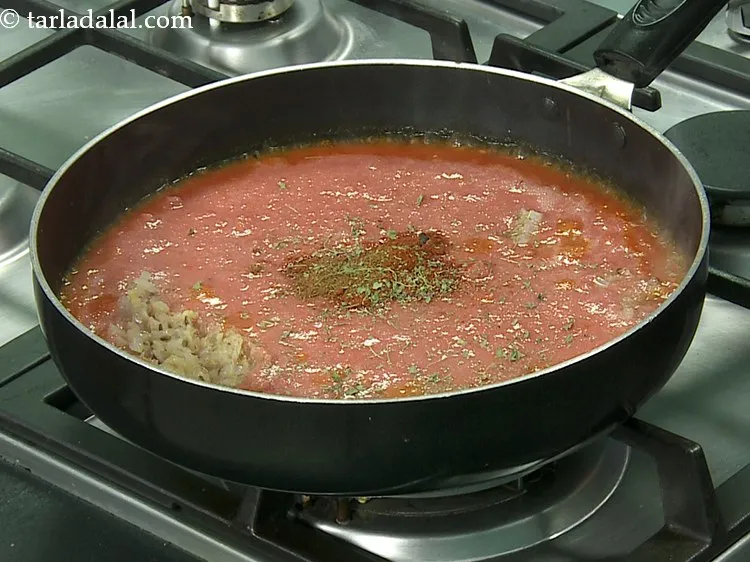 - टमाटर की पेस्ट, मिर्च पाउडर, गरम मसाला, कसूरी पत्ते, टमॅटो कैचप, चीनी और नमक डालकर अच्छी तरह मिलाएँ और मध्यम आँच पर 5 मिनट तक बीच-बीच में हिलाते हुए पकाएँ।