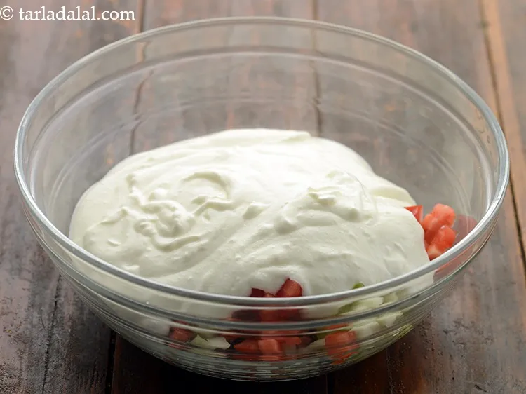 4. Pour this mixture over the raita and mix well.