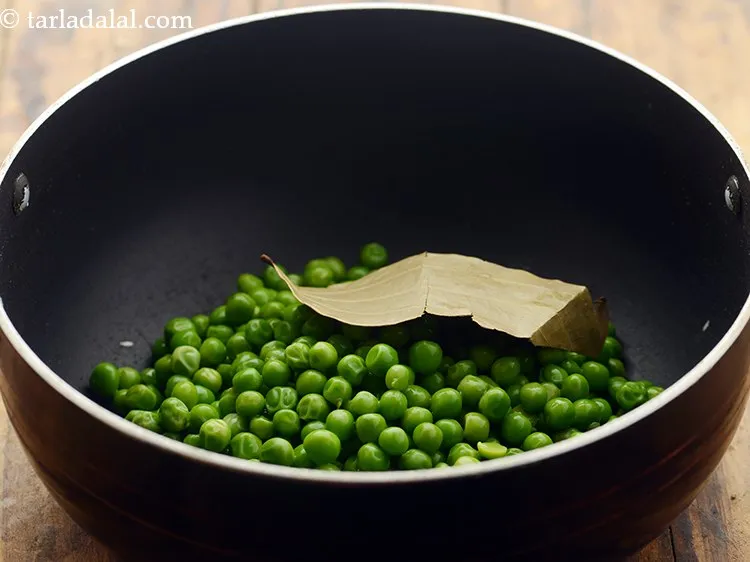 - To make bengali matarsutir dal, heat the ghee in a deep non-stick pan, add the boiled green peas and bayleaf and sauté on a medium flame for 2 minutes.