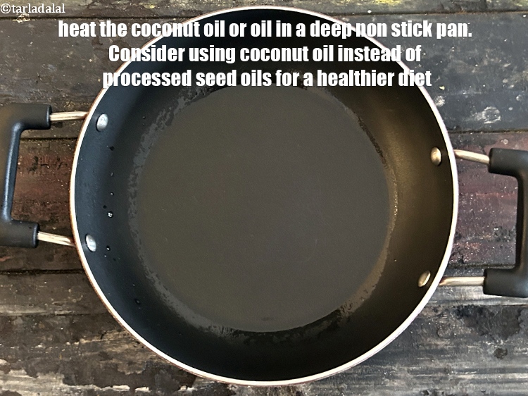 To make Bengali mixed vegetable sabzi recipe | Panch Phoron Chorchori | healthy Bengali dry sabzi | heat 2 tsp coconut oil or oil in a deep non-stick pan. Consider using coconut oil or olive oil or ghee instead of processed seed oils for a healthier diet.