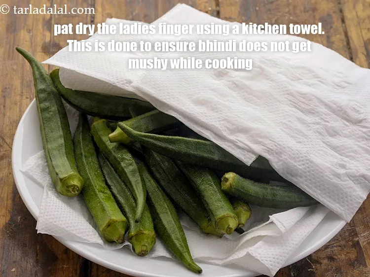 Pat dry the ladies finger using a kitchen towel. This is done to ensure bhindi does not get mushy while cooking.