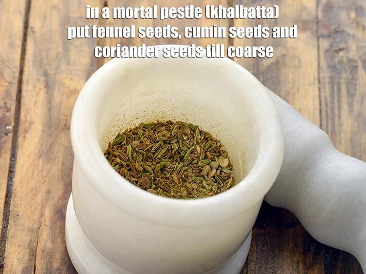 - Combine the fennel seeds, cumin seeds and coriander seeds in a mortal pestle (khalbatta) till coarse. Keep aside.