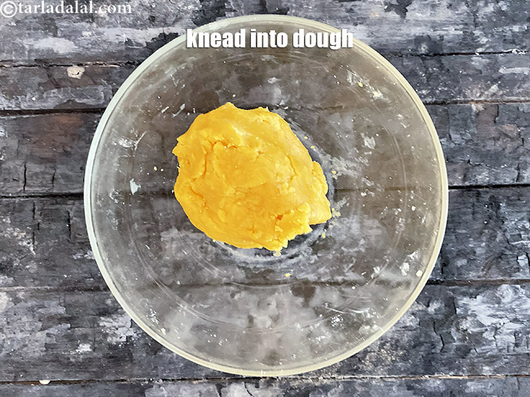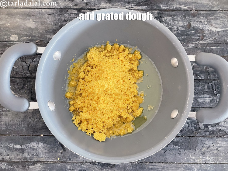 - Heat the remaining ghee in a broad vessel, add the grated dough mixture and cook on a slow flame for approx. 8 to 10 minutes, while stirring continuously. Keep aside.