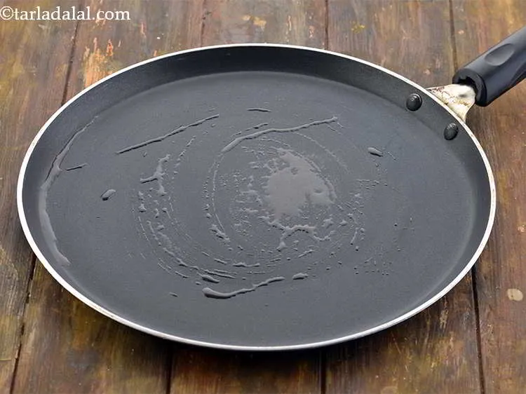 2. एक नॉन-स्टिक तवा गरम करें और 1/4 टी-स्पूनन तेल से चुपड़ लें।