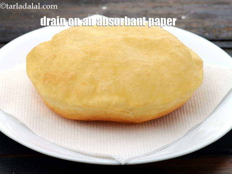 - Heat the oil in a deep non-stick kadhai and deep-fry the bhatura, one at a time on a medium flame, till they puff up and turn golden brown in colour on both the sides. Drain on an absorbent paper.