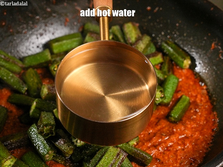 - Add the fried bhindi, salt and 3/4 cup hot water. Mix well and cook on a medium flame for 2 to 3 minutes.