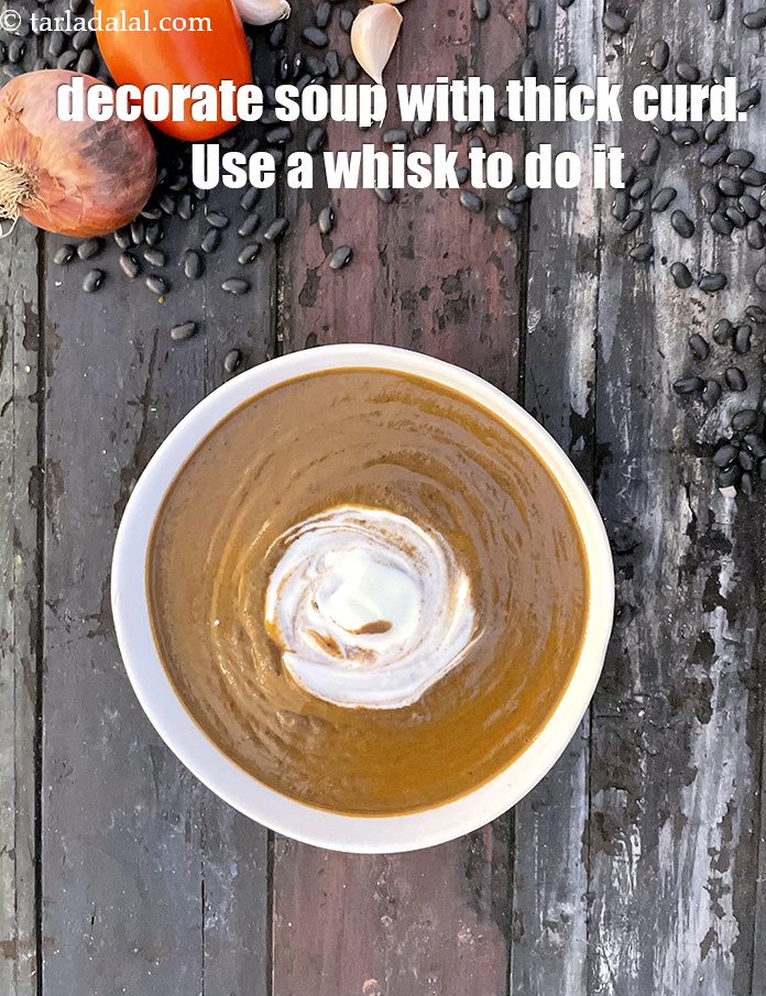 Garnish black bean soup | Mexican style black bean soup | healthy Indian black bean soup | with hung curds. Serve hot.