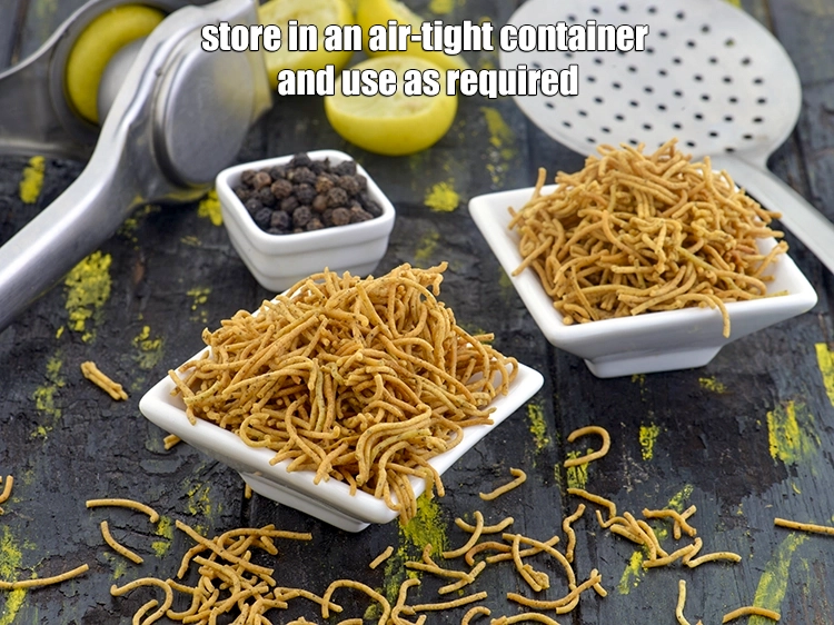 After frying, keep [the sev] aside to cool for 5 to 10 minutes. This cooling period allows the sev to fully crisp up. Once cooled, transfer the sev into a deep bowl and break into pieces using your fingers to make them ready for snacking. This chatpata Lemon Sev can be stored for an extended period, so transfer the cooled, broken pieces into an air-tight container and use as required.