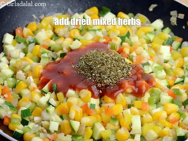 - Add the tomato pulp, oregano, chilli flakes, tomato ketchup, chilli powder and salt, mix well and cook on a medium flame for 5 to 6 minutes, while stirring occasionally.