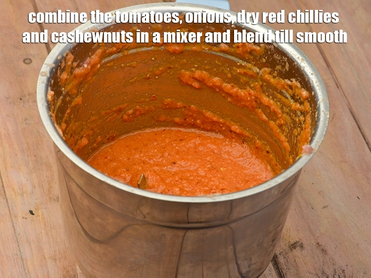 - ब्रोकली, गाजर और पनीर की सब्जी बनाने के लिए, टमाटर, प्याज़, सूखी लाल मिर्च और काजू को मिक्सर में मिलाएँ और चिकना होने तक पीस लें। एक तरफ रख दें।