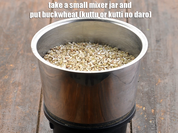 कुट्टू के डोसा का घोल बनाने के लिए | कुट्टू के आटे का डोसा | झटपट बक्वीट डोसा | buckwheat dosa in hindi | एक छोटा मिक्सर जार लें और उसमें 1 कप कुट्टू (buckwheat, kuttu or kutti no daro) डालें।