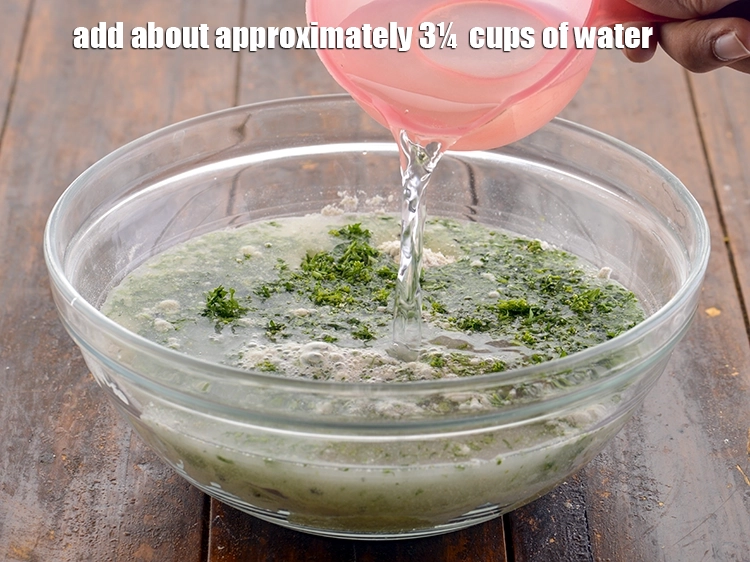- तैयार किया तड़का, हरी मिर्च, धनिया, नमक और लगभग 3 1/4 कप पानी पाउडर में डालें और अच्छी तरह मिला लें।