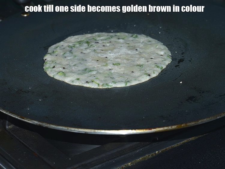 - तवे पर चम्मच भर घोल डालकर गोल घुमाकर डोसा बना लें। थोडा तेल डालें और दोनों तरफ से सुनहरा भूरा होने तक पका लें।
