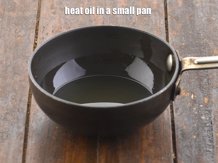 अब, कुट्टू के डोसा के घोल को स्वादिष्ट बनाना के लिए तड़का लगाएं गे। एक छोटे पैन या तड़के के पैन में 1 टेबल-स्पून तेल ( oil ) गरम करके।