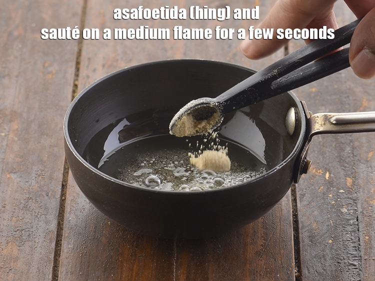 - जब बीज चटकने लगे, तब हींग डालें और मध्यम आंच पर कुछ सेकंड के लिए भून लें।
