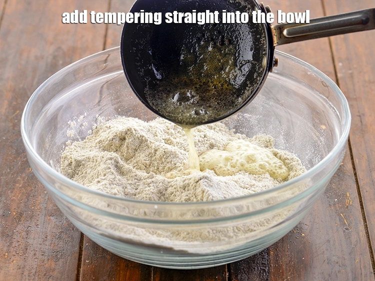 डोसा को पारंपरिक स्वादिष्ट स्वाद से भरने के लिए, एक त्वरित तड़का आवश्यक है। एक छोटे पैन में तेल गरम करें और राई/सरसों (mustard seeds/rai/sarson) डालें। एक बार जब बीज चटकने (crackle) लगें, यह दर्शाता है कि तेल गर्म है, तो हींग (asafoetida/hing) डालें और मध्यम आंच पर थोड़े समय के लिए भूनें। इस तड़के को सीधे तैयार पाउडर में, बारीक कटी हरी मिर्च, धनिया, स्वादानुसार नमक, और लगभग 341कप पानी के साथ मिलाया जाता है। फिर मिश्रण को अच्छी तरह से हिलाया जाता है ताकि एक चिकना, डालने योग्य बैटर बन सके।